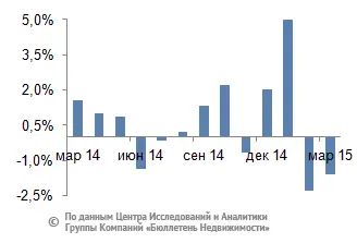 За прошедший месяц на рынке новостроек изменение стоимости одно-, двух- и трехкомнатных квартир в кирпично-монолитных домах составило минус 1,2%, минус 4,2% и минус 1,8% соответственно. Изменение стоимости квадратного метра в панельных домах по отношению к февралю 2015 года составило для однокомнатных квартир – 3,2%, для двухкомнатных – 4,7%, для трехкомнатных квартир – 3,8%.