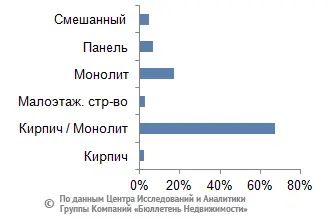 В предложении с разбивкой по типу домов по-прежнему преобладают кирпично-монолитные дома, это 67,2% от всего рынка. Меньшая доля предложения в малоэтажных объектах – 2,6% от общего объема новостроек. Доля домов смешанного типа – это, как правило, дома с корпусами, построенными по различным технологиям (кирпично-монолитной и панельной), – составляет 4,6%.