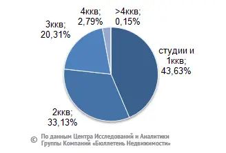 В структуре текущего предложения на рынке новостроек в марте 2015 года, как и в конце февраля 2015 года, преобладают студии, одно- и двухкомнатные квартиры, что занимает 76,8% рынка, трехкомнатные – в среднем 20,3%. Многокомнатные (четыре комнаты и более) составляют 2,9% от общего объема квартир в строящихся домах.