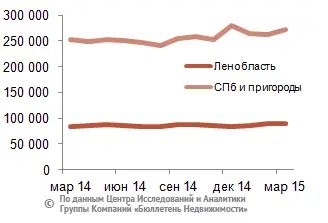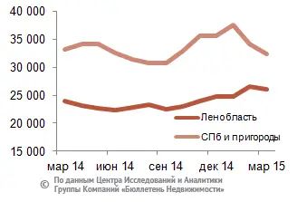Изменение стоимости домостроений (без учета стоимости земли) за месяц составило минус 1,7% по Ленинградской области и минус 5,4% по Петербургу и пригородным районам. На конец марта 2015 года средняя цена предложения домостроений по области составила 26 тыс. руб. за кв. м (в среднем 3 млн руб. за объект), по районам Петербурга и пригородам – 32,3 тыс. руб. за кв. м (в среднем 5 млн руб. за строение, без учета стоимости участка).