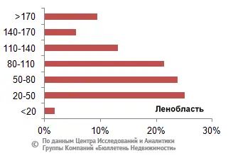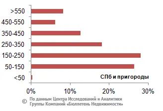 Максимальное количество предложений участков без домостроений Ленинградской области находится в ценовом диапазоне от 20 до 50 тыс. руб., от 50 до 80 тыс. руб. и от 80 до 110 тыс. руб. за сотку, что занимает 25,1%, 23,8% и 21,4% соответственно, а также от 110 до 140 тыс. руб. за сотку, что составляет 13,1% от всего предложения. На рынке земельных участков Петербурга и пригородных районов максимальный объем предложения приходится на диапазон от 50 до 150 тыс.руб., от 150 до 250 тыс. руб. и от 250 до 350 тыс. руб. за сотку, что составляет соответственно 26,4%, 28,1% и 18,2% от всего предложения.