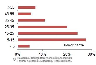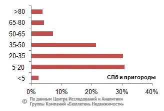 Максимальное количество предложений домов по Ленинградской области находится в ценовом диапазоне от 5 до 15 тыс. руб. и от 15 до 25 тыс. руб. за кв. м, что занимает 27,7% и 24,2% соответственно от общего количества продаваемых объектов. В Петербурге и его пригородах максимальный объем домостроений находится в диапазонах от 5 до 20 тыс. руб. и от 20 до 35 тыс. за «квадрат», составляющих 30,8% и 30,3% соответственно, в зависимости от материала стен, месторасположения и коммуникаций.