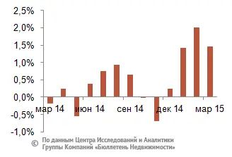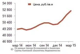 Доля объектов, цена которых меньше 30 тыс. руб. за кв. м, составляет в марте 2015 года 11,6% от общего объема предложения квартир. Большую долю рынка занимает диапазон цены от 30 до 70 тыс. руб. за кв. м, это 71,8% от объема выставленных на продажу квартир. Диапазон стоимости квадратного метра от 70 до 80 тыс. руб. занимает 11%. Доля дорогих объектов, цена которых превышает 80 тыс. руб. за кв. м, составляет 5,7% от всего предложения.
