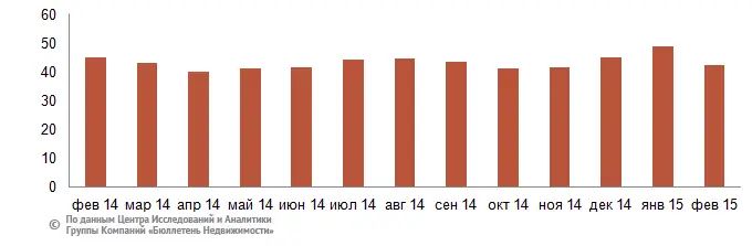 В феврале по сравнению с январем на 13% уменьшилось и время экспозиции объектов в листингах (см. график 2). По сведениям на конец зимы, среднестатистическая квартира экспонировалась в каталогах объявлений 42 дня.