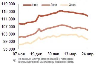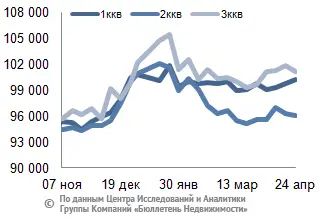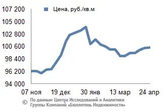 За минувший период изменение средней цены предложения на рынке новостроек в рублевом эквиваленте составило 0,1%, это 98,5 руб. с кв. м. Показатель средней цены предложения за неделю с 17 по 24 апреля 2015 года – 100,4 тыс. руб. за кв. м. Стоимость предложения в долларах – 1,9 тыс. за кв. м, в евро – 1,8 тыс. за кв. м.