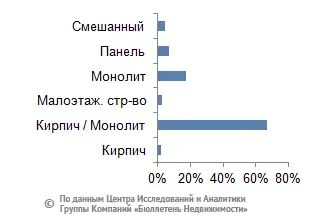 В предложении с разбивкой по типу домов по-прежнему преобладают кирпично-монолитные дома, это 67,2% от всего рынка. Меньшая доля предложения в кирпичных и малоэтажных объектах – 2% и 2,5% от общего объема новостроек. Доля домов смешанного типа – это, как правило, дома с корпусами, построенными по различным технологиям (кирпично-монолитной и панельной) – составляет 4,6%.
