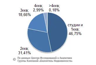В структуре текущего предложения на рынке новостроек в апреле 2015 года, как и в конце марта 2015 года, преобладают студии, одно- и двухкомнатные квартиры, что занимает 78,2% рынка, трехкомнатные – в среднем 18,7%. Многокомнатные (четыре комнаты и более) составляют 3,2% от общего объема квартир в строящихся домах.