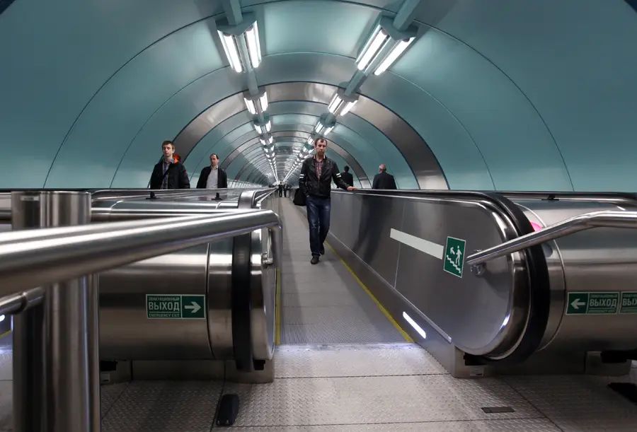 На станции «Спортивная» впервые применяются траволаторы – всего их установлено шесть. С их помощью пассажиры преодолевают тоннель длиной 300 м