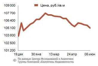 За минувший период изменение средней цены предложения на вторичном рынке квартир в рублевом эквиваленте составило минус 0,4%, это 444,7 руб. с кв. м. Показатель средней цены предложения за неделю с 29 мая по 05 июня 2015 года составил 105,1 тыс. руб. за кв. м. Цена предложения в долларах – 1,9 тыс. за кв. м, в евро – 1,7 тыс. за кв. м.