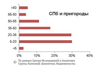 Максимальное количество предложений домов по Ленинградской области находится в ценовом диапазоне от 5 до 15 тыс. руб., от 15 до 25 тыс. руб. и от 25 до 35 тыс. руб. за кв. м, что занимает 26,8%, 25,7% и 20,3% соответственно от общего количества продаваемых объектов. В Петербурге и его пригородах максимальный объем домостроений находится в диапазонах от 5 до 20 тыс. руб., и от 20 до 35 тыс. за «квадрат», составляющих 30% и 29,7% соответственно, в зависимости от материала стен, месторасположения и коммуникаций.