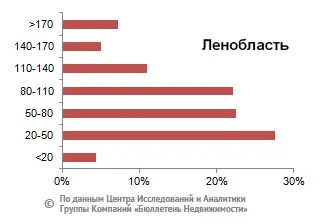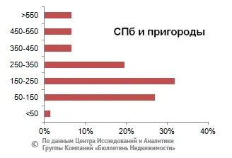 Максимальное количество предложений участков без домостроений Ленинградской области находится в ценовом диапазоне от 20 до 50 тыс. руб., от 50 до 80 тыс. руб. и от 80 до 110 тыс. руб. за сотку, что занимает 27,6%, 22,6% и 22,2% соответственно, а также от 110 до 140 тыс. руб. за сотку, что составляет 11% от всего предложения.На рынке земельных участков Петербурга и пригородных районов максимальный объем предложения приходится на диапазон от 50 до 150 тыс.руб., от 150 до 250 тыс. руб. и от 250 до 350 тыс. руб. за сотку, что составляет соответственно 27%, 31,9% и 19,6% от всего предложения.