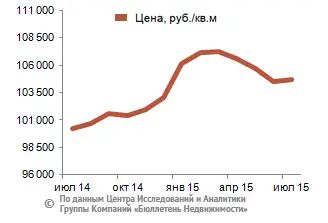 Доля объектов, цена которых меньше 80 тыс. руб. за кв. м, составила в июле 2015 года 9,7% от общего объема предложения квартир. Большую долю рынка занимает диапазон цены от 80 до 120 тыс. руб. за кв. м, это 71,3% от объема выставленных на продажу квартир. Диапазон стоимости квадратного метра от 120 до 140 тыс. руб. занимает 11,7%. Доля дорогих объектов, цена которых превышает 140 тыс. руб. за кв. м, составляет 7,3% от всего предложения.