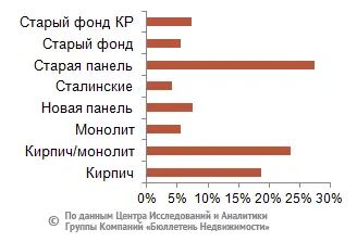 В предложении с разбивкой по типу дома в июле 2015-го, как и в июне, преобладают кирпичные и кирпично-монолитные дома, в сумме их доля на конец июля составляет 42,4%. Также наибольший объем в структуре предложения занимают панельные дома старой постройки – 27,5% от всего рынка. Меньший процент приходится на квартиры в сталинских домах.