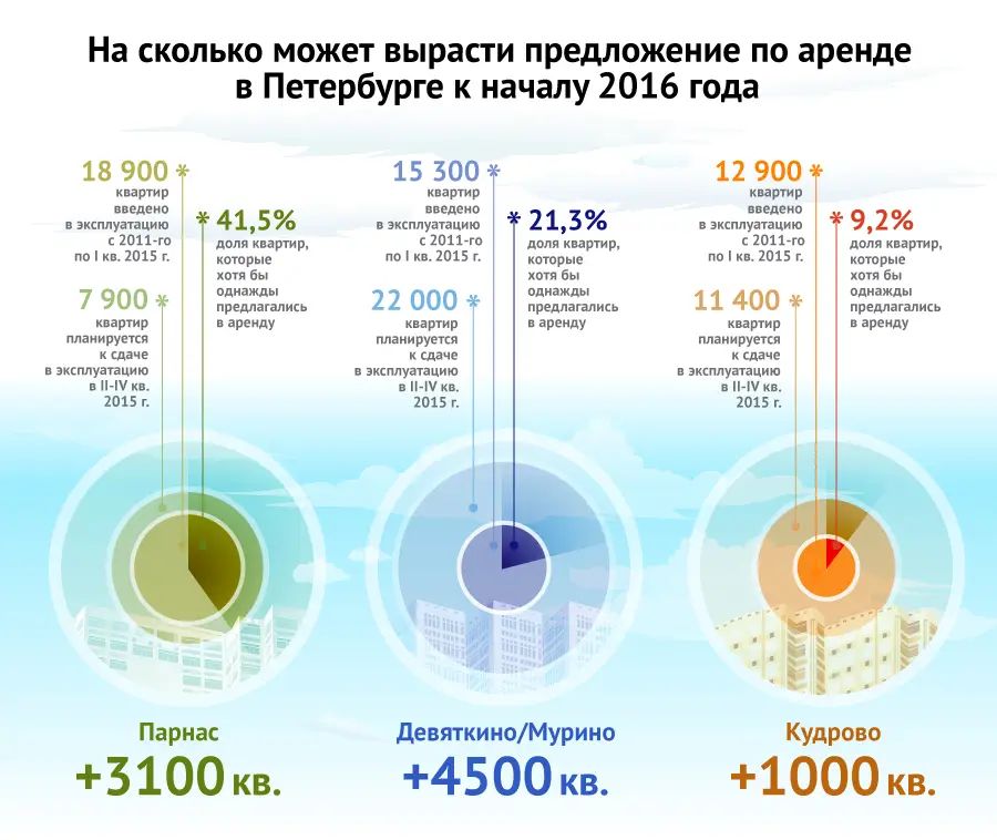 Из числа территорий с бурным ростом арендного жилья особенно выделяются три зоны: Парнас, Мурино – Новое Девяткино и Кудрово. Количество уникальных предложений аренды в данных локациях за первые шесть месяцев года практически сравнялось с аналогичным показателем за весь 2014-й. А по некоторым типам квартир даже превысило прошлогодние цифры.