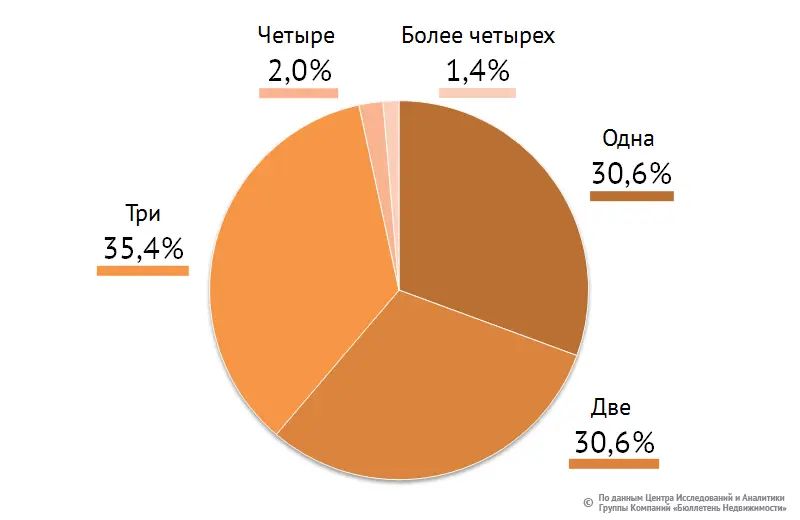 По типам квартир между одно-, двух- и трехкомнатными предложение распределено куда более равномерно: 30%, 30% и 35% соответственно. Остальное – квартиры с четырьмя комнатами и более.