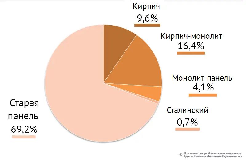 Почти 70% всего предложения приходится на «старую панель», на втором месте (16,4%) – кирпич-монолит, около 10% рынка занимают квартиры в кирпичных домах, 4% – в панельно-монолитных, менее 1% – жилье в сталинках.