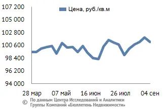 За минувший период изменение средней цены предложения на рынке новостроек в рублевом эквиваленте составило минус 0,7%, это 750,1 руб. с кв. м. Показатель средней цены предложения за неделю с 28 августа по 04 сентября 2015 года – 101,2 тыс. руб. за кв. м. Стоимость предложения в долларах – 1,5 тыс. за кв. м, в евро – 1,3 тыс. за кв. м.