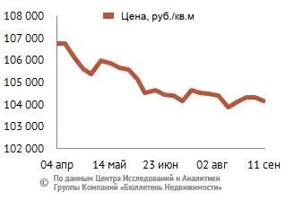 За минувший период изменение средней цены предложения на вторичном рынке квартир в рублевом эквиваленте составило минус 0,2%, это 172 руб. с кв. м. Показатель средней цены предложения за неделю с 04 сентября по 11 сентября 2015 года составил 104,2 тыс. руб. за кв. м. Цена предложения в долларах – 1,5 тыс. за кв. м, в евро – 1,4 тыс. за кв. м.