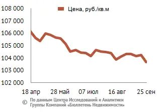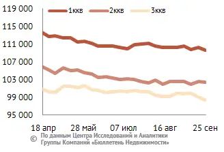 За минувший период изменение средней цены предложения на вторичном рынке квартир в рублевом эквиваленте составило минус 0,5%, это 549 руб. с кв. м. Показатель средней цены предложения за неделю с 18 сентября по 25 сентября 2015 года составил 103,7 тыс. руб. за кв. м. Цена предложения в долларах – 1,6 тыс. за кв. м, в евро – 1,4 тыс. за кв. м.