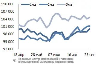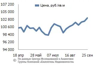 За минувший период изменение средней цены предложения на рынке новостроек в рублевом эквиваленте составило 1%, это 985 руб. с кв. м. Показатель средней цены предложения за неделю с 18 сентября по 25 сентября 2015 года – 103,2 тыс. руб. за кв. м. Стоимость предложения в долларах – 1,6 тыс. за кв. м, в евро – 1,4 тыс. за кв. м.