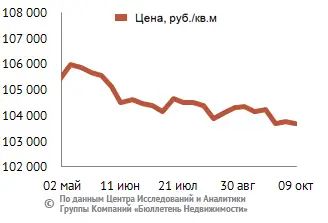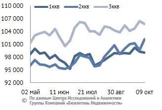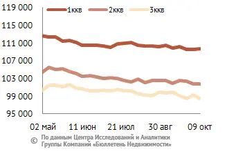 За минувший период изменение средней цены предложения на вторичном рынке квартир в рублевом эквиваленте составило минус 0,1%, это 94 руб. с кв. м. Показатель средней цены предложения за неделю с 02 октября по 09 октября 2015 года составил 103,7 тыс. руб. за кв. м. Цена предложения в долларах – 1,7 тыс. за кв. м, в евро – 1,5 тыс. за кв. м.
