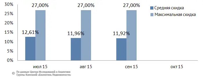 Уже первые замеры принесли интересные результаты (см. графики). Выяснилось, что в третьем квартале этого года средний размер скидки при стопроцентной оплате и ипотеке составил около 12%. А максимальная доходила до 27%.