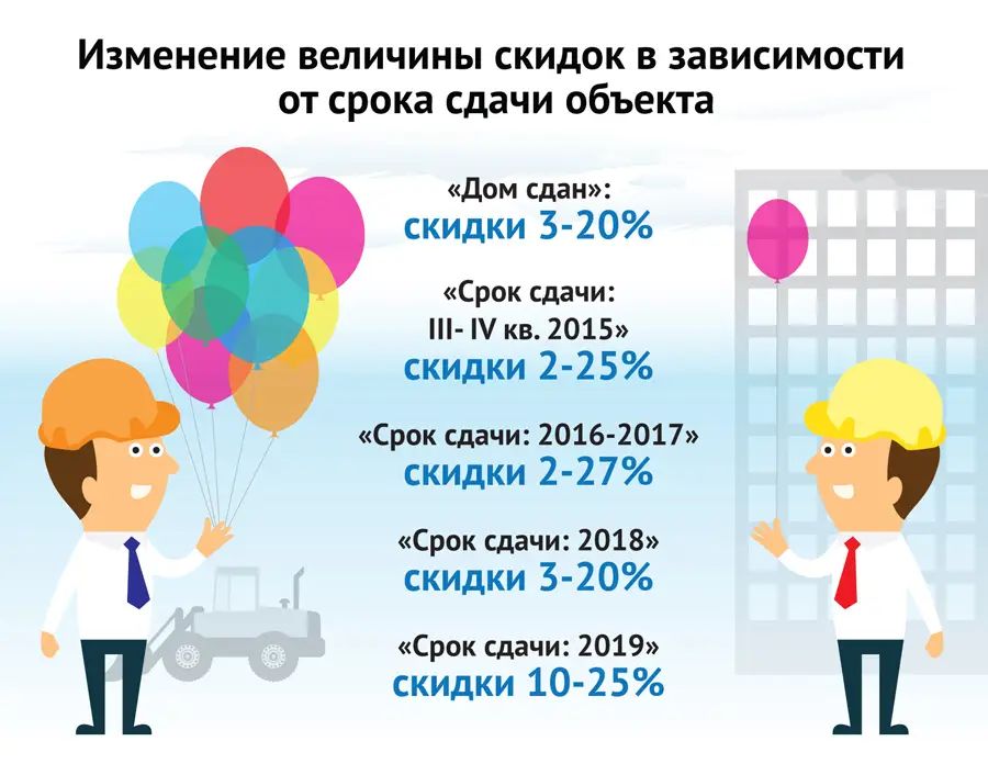 Похожие примеры можно найти в других жилых комплексах. Так, в ЖК «Новое Мурино» от компании «ЦДС» в январе 2015-го можно было купить студию площадью 22,6 кв. м в доме, сдающемся примерно через год, за 1,84 млн руб. В сентябре объект со схожими характеристиками стоил чуть менее 1,5 млн руб., или на 19% дешевле.
