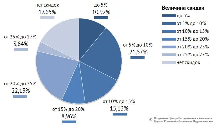 Примерно шестая часть застройщиков (17%) вовсе не проводят акций, еще 11% предоставляют минимальные скидки. Но подавляющее большинство (46%) готовы уступить 10-25% от базовой цены. Наиболее щедры компании «Мавис», Setl City, «Полис Групп», «ЦДС», «Лидер Групп» и MirLand Development.