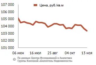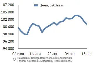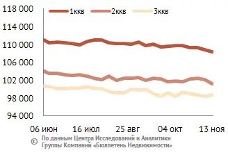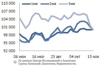 За минувший период изменение средней цены предложения на рынке новостроек в рублевом эквиваленте составило минус 0,9%, это 923 руб. с кв. м. Показатель средней цены предложения за неделю с 06 ноября по 13 ноября 2015 года – 101,4 тыс. руб. за кв. м. Стоимость предложения в долларах – 1,5 тыс. за кв. м, в евро – 1,4 тыс. за кв. м.