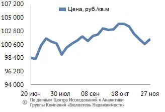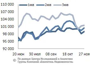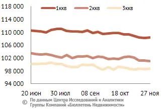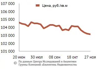 За минувший период изменение средней цены предложения на вторичном рынке квартир в рублевом эквиваленте составило минус 0,1%, это 75 руб. с кв. м. Показатель средней цены предложения за неделю с 20 ноября по 27 ноября 2015 года составил 103,2 тыс. руб. за кв. м. Цена предложения в долларах – 1,6 тыс. за кв. м, в евро – 1,5 тыс. за кв. м.
