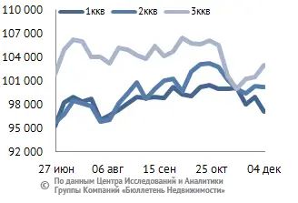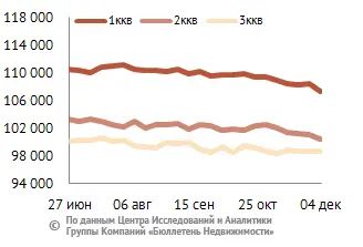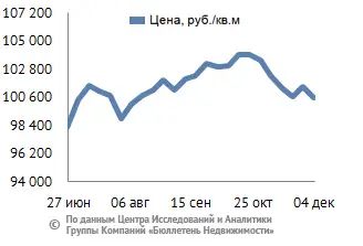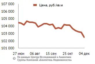 За минувший период изменение средней цены предложения на вторичном рынке квартир в рублевом эквиваленте составило минус 0,7%, это 684 руб. с кв. м. Показатель средней цены предложения за неделю с 27 ноября по 04 декабря 2015 года составил 102,5 тыс. руб. за кв. м. Цена предложения в долларах – 1,5 тыс. за кв. м, в евро – 1,4 тыс. за кв. м.