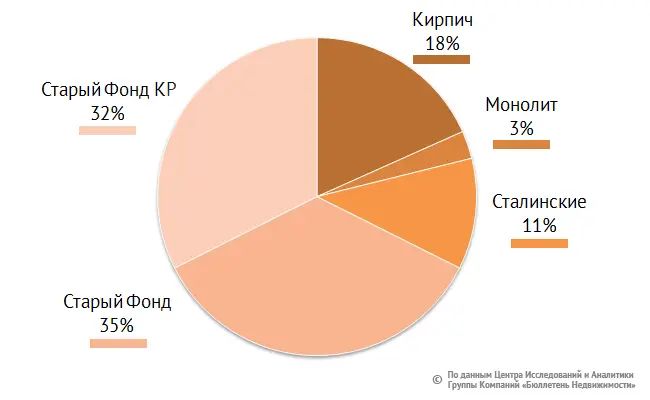 В структуре предложения на вторичном рынке жилья около 70% объектов представлены квартирами в домах старого фонда. По данным Центра исследований и аналитики ГК «Бюллетень Недвижимости», почти половина из них расположена в домах после капремонта. Еще 11% рынка занимают сталинки и 18% – квартиры в кирпичных домах, как правило, построенных во второй половине прошлого века.