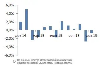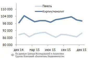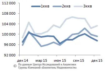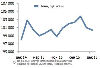 За минувший 2015 год изменение средней цены предложения на рынке строящегося жилья в рублевом эквиваленте составило 2,4%, это 2 370 руб. с кв. м. Показатель средней цены предложения квартир в новостройках в декабре 2015 года составил 100,4 тыс. руб. за кв. м.