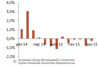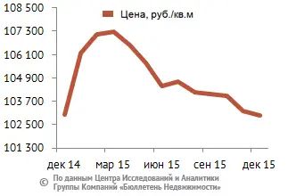 За минувший 2015 год изменение средней цены предложения на вторичном рынке квартир в рублевом эквиваленте составило минус 0,1%, это 72 тыс. руб. с кв. м. Показатель средней цены предложения в декабре 2015 года составил 103 тыс. руб. за кв. м.