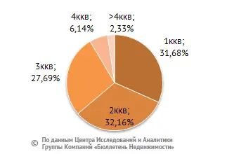 В структуре предложения на вторичном рынке квартир по-прежнему преобладают одно-, двух- и трехкомнатные квартиры, они составили в декабре 2015 года 91,5% рынка, многокомнатные – в среднем 8,5% от общего объема.