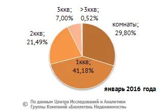 В структуре предложения на рынке аренды типового жилья в январе 2016 года по-прежнему преобладают комнаты и однокомнатные квартиры, занимая соответственно 29,8 и 41,2% рынка. Двухкомнатные квартиры составляют 21,5%, доля трехкомнатных не превышает 7%. Многокомнатные (четыре комнаты и более) составляют 0,5% от общего объема типовых квартир, предлагаемых в аренду.