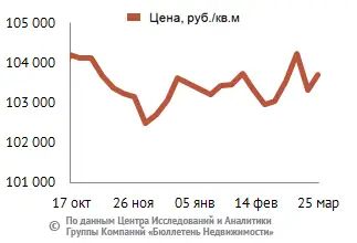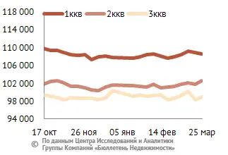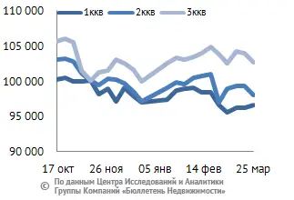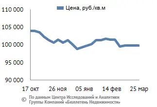 Доля объектов, цена которых меньше 75 тыс. руб. за кв. м, составляет 19,1% от общего объема предложения квартир. Большую долю рынка занимают цены в диапазоне от 75 до 105 тыс. руб. за кв. м, что составляет 45,2% от объема выставленных на продажу квартир. Диапазон стоимости квадратного метра от 105 до 135 тыс. руб. – 19,3%. Доля дорогих объектов, цена которых превышает 135 тыс. руб. за кв. м, в сумме – 16,4% от всего предложения.