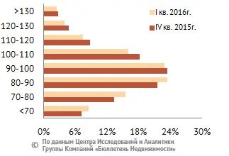 Доля дешевых объектов, цена которых меньше 70 тыс. руб. за кв. м, составляет 8,5%. Диапазон стоимости от 70 до 80 тыс. руб. занимает 15,5% от общего объема предложения комнат. Большую долю рынка занимает диапазон цены от 80 до 110 тыс. руб. за кв. м, это 62,2% от объема выставленных на продажу комнат, диапазон цены от 110 до 120 тыс. руб. – 7,5%. Доля дорогих объектов, цена которых превышает 120 тыс. руб. за кв. м, составляет 6,3% от всего предложения.
