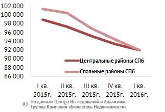 За прошедший период самый большой процент изменения средней цены предложения показали комнаты спальных районов, расположенные в домах старого фонда без капитального ремонта, панельных домах современной постройки и кирпично-монолитных домах – минус 6,6%, 5,4% и 4,4% соответственно. Наибольший процент у комнат центральных районов – в домах сталинской постройки, изменение составило минус 3,2%. Самыми дорогими по стоимости квадратного метра являются комнаты в панельных домах спальных районов Санкт-Петербурга, стоимость на конец квартала составила в среднем 99 тыс. руб. за кв. м.