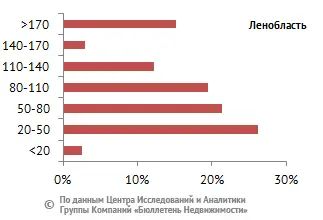 Максимальное количество предложений участков без домостроений Ленинградской области находится в ценовом диапазоне от 20 до 50 тыс. руб., от 50 до 80 тыс. руб. и от 80 до 110 тыс. руб. за сотку, что занимает 26,2%, 21,4% и 19,6% соответственно, а также от 110 до 140 тыс. руб. за сотку, что составляет 12,2% от всего предложения.