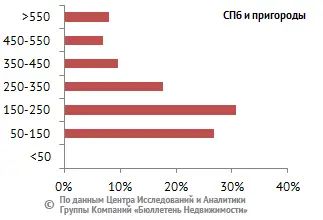 На рынке земельных участков Петербурга и пригородных районов максимальный объем предложения приходится на диапазон от 50 до 150 тыс. руб., от 150 до 250 тыс. руб. и от 250 до 350 тыс. руб. за сотку, что составляет соответственно 26,9%, 30,7% и 17,7% от всего предложения.