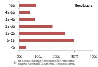 Максимальное количество предложений домов по Ленинградской области находится в ценовом диапазоне от 5 до 15 тыс. руб., от 15 до 25 тыс. руб. и от 25 до 35 тыс. руб. за кв. м, что занимает 29,6%, 24,9% и 18,1% соответственно от общего количества продаваемых объектов.