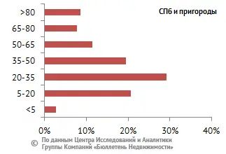 В Петербурге и его пригородах максимальный объем домостроений находится в диапазонах от 5 до 20 тыс., от 20 до 35 тыс. и от 35 до 50 тыс. руб. за «квадрат», составляющих 20,6%, 29,3% и 19,5% соответственно, в зависимости от материала стен, месторасположения и коммуникаций.