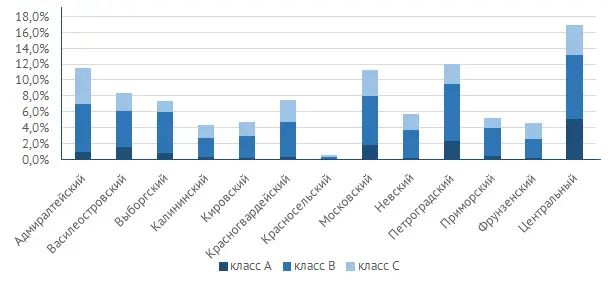 Примерно треть всех офисов классов А и В сосредоточены в Центральном и Московском районах, а объектов класса С больше всего в Адмиралтейском.