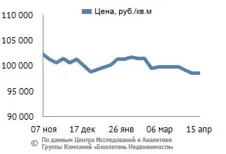 Доля объектов, цена которых меньше 75 тыс. руб. за кв. м, составляет 19,9% от общего объема предложения квартир. Большую долю рынка занимают цены в диапазоне от 75 до 105 тыс. руб. за кв. м, что составляет 46,8% от объема выставленных на продажу квартир. Диапазон стоимости квадратного метра от 105 до 135 тыс. руб. – 17,9%. Доля дорогих объектов, цена которых превышает 135 тыс. руб. за кв. м, в сумме – 15,4% от всего предложения.