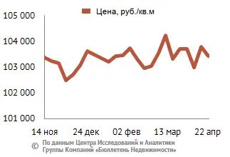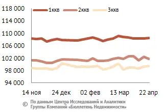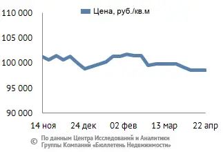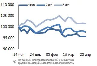 Доля объектов, цена которых меньше 85 тыс. руб. за кв. м, составляет 23% от общего объема предложения квартир. Большую долю рынка занимают цены диапазона от 85 до 105 тыс. руб. за кв. м, что составляет 41% от объема выставленных на продажу квартир. Диапазон стоимости квадратного метра от 105 до 125 тыс. руб. занимает 21,7%. Доля дорогих объектов, цена которых превышает 125 тыс. руб. за кв. м, – 14,3% от всего предложения.