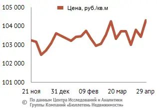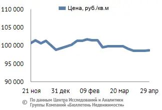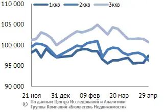 Доля объектов, цена которых меньше 75 тыс. руб. за кв. м, составляет 15,1% от общего объема предложения квартир. Большую долю рынка занимают цены в диапазоне от 75 до 105 тыс. руб. за кв. м, что составляет 50% от объема выставленных на продажу квартир. Диапазон стоимости квадратного метра от 105 до 135 тыс. руб. – 20%. Доля дорогих объектов, цена которых превышает 135 тыс. руб. за кв. м, в сумме – 15% от всего предложения.