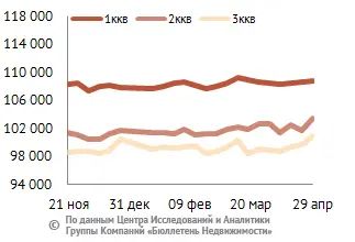 Доля объектов, цена которых меньше 85 тыс. руб. за кв. м, составляет 23,6% от общего объема предложения квартир. Большую долю рынка занимают цены диапазона от 85 до 105 тыс. руб. за кв. м, что составляет 38,7% от объема выставленных на продажу квартир. Диапазон стоимости квадратного метра от 105 до 125 тыс. руб. занимает 22,2%. Доля дорогих объектов, цена которых превышает 125 тыс. руб. за кв. м, – 15,4% от всего предложения.
