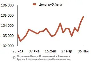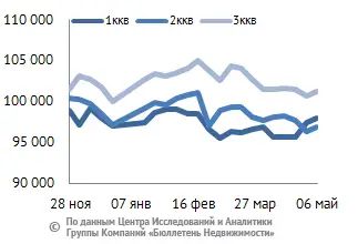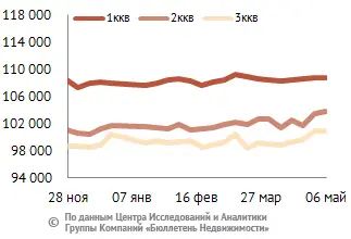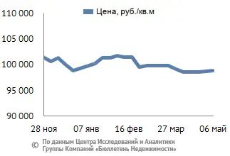 Доля объектов, цена которых меньше 75 тыс. руб. за кв. м, составляет 16,8% от общего объема предложения квартир. Большую долю рынка занимают цены в диапазоне от 75 до 105 тыс. руб. за кв. м, что составляет 44,1% от объема выставленных на продажу квартир. Диапазон стоимости квадратного метра от 105 до 135 тыс. руб. – 20,7%. Доля дорогих объектов, цена которых превышает 135 тыс. руб. за кв. м, в сумме – 18,4% от всего предложения.