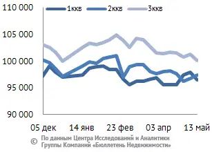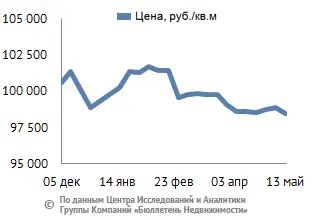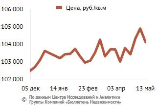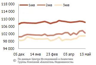 Доля объектов, цена которых меньше 75 тыс. руб. за кв. м, составляет 18,8% от общего объема предложения квартир. Большую долю рынка занимают цены в диапазоне от 75 до 105 тыс. руб. за кв. м, что составляет 44,6% от объема выставленных на продажу квартир. Диапазон стоимости квадратного метра от 105 до 135 тыс. руб. – 20,9%. Доля дорогих объектов, цена которых превышает 135 тыс. руб. за кв. м, в сумме – 15,7% от всего предложения.